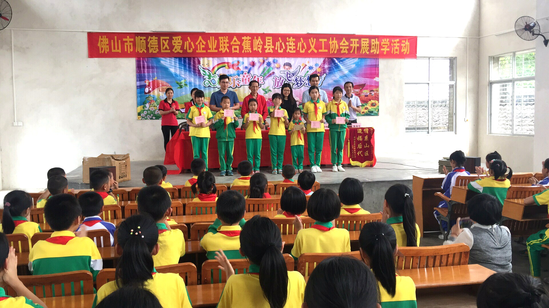 5月24日,九極公司與七家愛心企業(yè),聯(lián)合梅州市蕉嶺縣心連心義工協(xié)會,對蕉嶺縣的藍(lán)坊鎮(zhèn)高思小學(xué)和長潭鎮(zhèn)